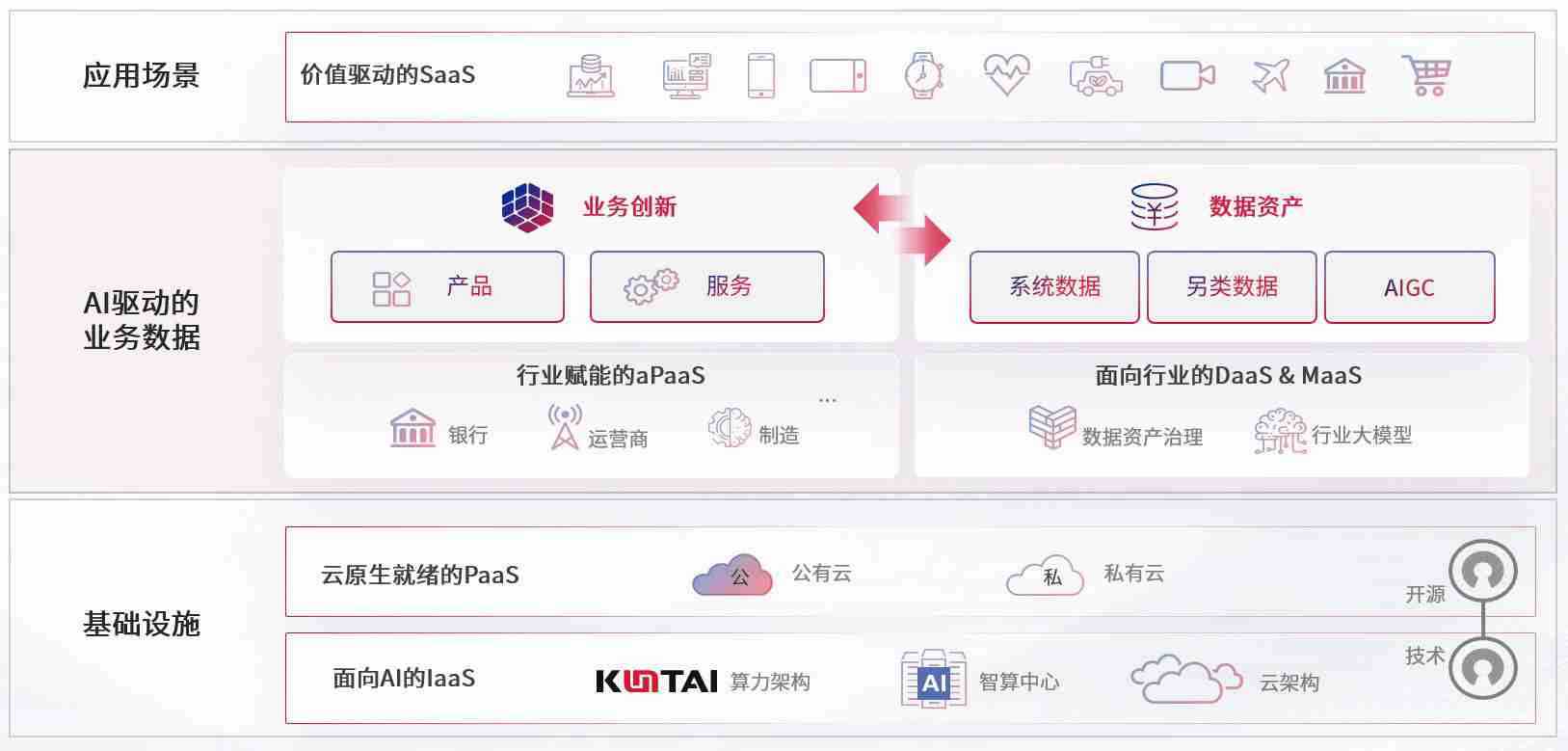 数字时代,,,围绕企业数字化转型的关键要素,,9B娱乐数码开创性的提出数云融合战略和技术体系框架,,,,着力在云原生、、、数字原生、、AI原生和信创产业上架构产品和服务能力,,,为处在不同数字化转型阶段的快消零售、、汽车、、、金融、、、医疗、、、政企、、教育、、、运营商等行业客户提供泛在的敏捷IT能力和融合的数据驱动能力,,构建跨界融合创新的数字业务场景和新业务模式,,助力企业级客户建立面向未来的核心能力和竞争优势,,,,全面推动社会的数字化、、、智能化转型升级。。。