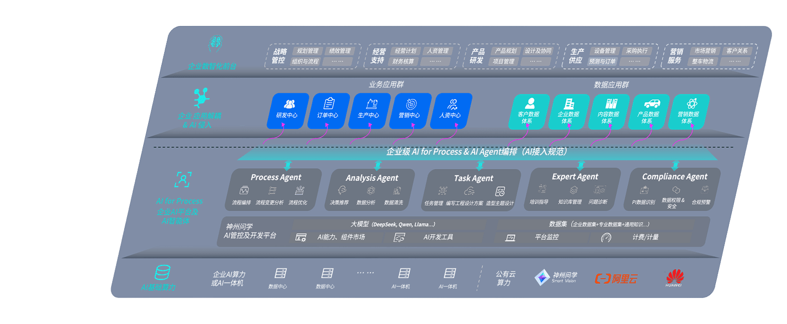 端到端的一站式AI工作空间深度融合了从企业战略规划到日常经营的全流程业务板块,,定向解决车企内部领域多、、、部门多、、、、链条长、、、场景碎片化等难题,,支持车企快速构建以AI为核心的生产力写作体系,,实现任务执行与AI能力的无缝集成与交互